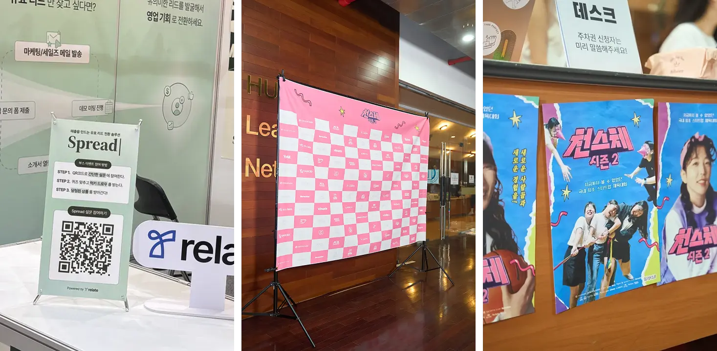 먼저 부스 디스플레이와 전시회 굿즈가 시너지를 낼 수 있도록 엑스배너, 포토존 백월 같은 전시 요소를 함께 준비하는 것부터 시작하세요.